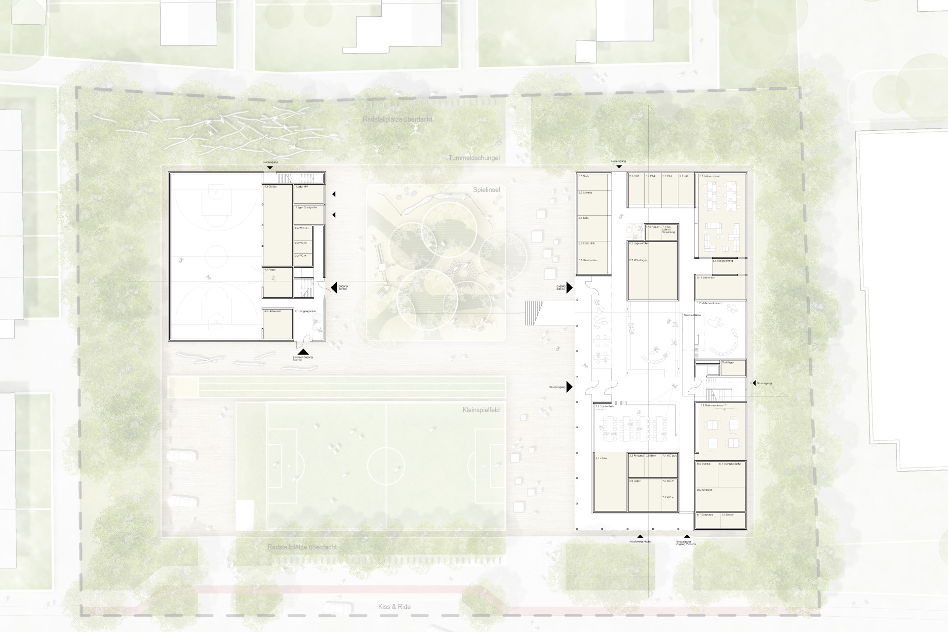 Auch der Freiraum unterstützt dieses offene Lernverständnis: Bewegungsangebote, Rückzugsbereiche und großzügige Grünflächen schaffen ein vielfältig nutzbares Außengelände, das Lernen, Spielen und Begegnen gleichermaßen ermöglicht.